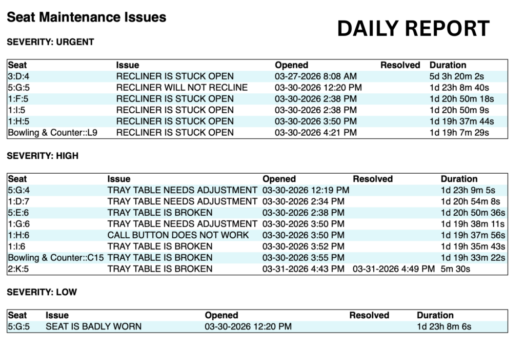 - Automated Notifications & Reporting: Issue reports are automatically distributed via email based on severity and location. Daily reports include open issues, with optional dedicated “Seat Issues” reports sent on customizable schedules.